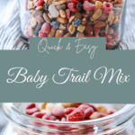 A fun and easy snack mix that even grown-ups can’t resist, this Baby Trail Mix is the ultimate combination of crunch, sweetness, and melt-in-your-mouth goodness. I like how quick it is to put together and how adaptable it is for babies, toddlers, and even older kids. Whether I’m packing a diaper bag or just need something to toss in a snack container for school or errands, this mix always hits the spot.