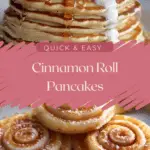 Fluffy pancakes swirled with a sweet cinnamon filling and topped with a creamy glaze, combining the best flavors of cinnamon rolls and classic pancakes.