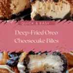 Deep-Fried Oreo Cheesecake Bites are indulgent bite-sized desserts featuring a creamy cheesecake filling wrapped in Oreo cookies, coated in a crispy batter, and fried to golden perfection.