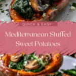 Wholesome Mediterranean stuffed sweet potatoes filled with savory garlic mushrooms and spinach, finished with herbs and optional feta for a nourishing and flavorful meal.