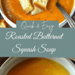 A cozy and creamy roasted butternut squash soup blended with apple for a hint of brightness—roasted vegetables, fragrant broth and silky texture make it perfect for fall or a comforting meal any time.