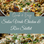 Salsa Verde Chicken & Rice Skillet is a hearty one-pan dinner made with shredded chicken, salsa verde, beans, rice, and melty cheese. It’s quick to prepare, full of flavor, and perfect for busy weeknights or meal prep.