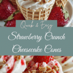 Strawberry Crunch Cheesecake Cones are a no-bake dessert that transforms creamy cheesecake filling, vibrant strawberry sauce, and a crunchy vanilla-strawberry topping into a fun, handheld treat served in a crispy waffle cone.